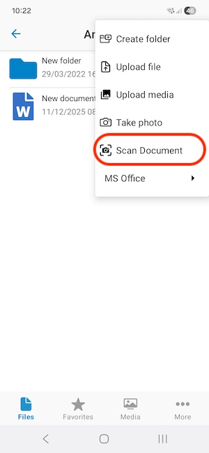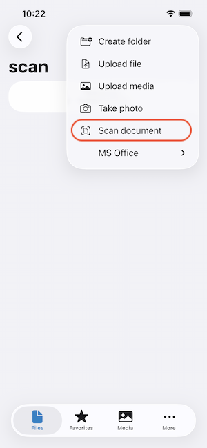Open the Files tab in the App, browse to the directory where you want to save your document, click on the plus icon in the top right corner and select "Scan documents". Now the camera view opens and you just need to point your phone so that the whole document is visible on the screen. Keep your phone still until the app has found and identified the document, it will then take the picture and crop it itself. After the document is scanned, you can either go ahead and scan the next page of your document or click on the "Save" button to upload the document to Storegate.