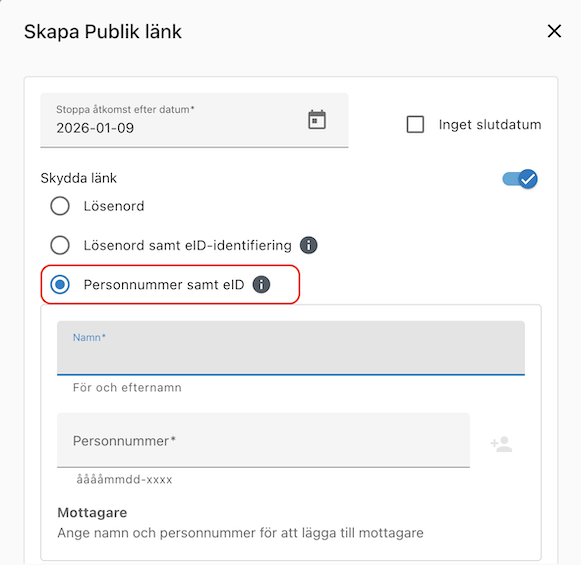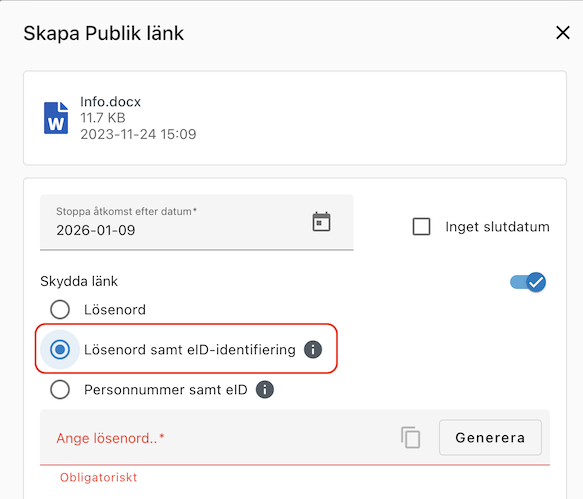 Om du har valt att köpa tilläggstjänsten Dela filer med eID så finns det 2 olika sätt att skydda den publika länken: