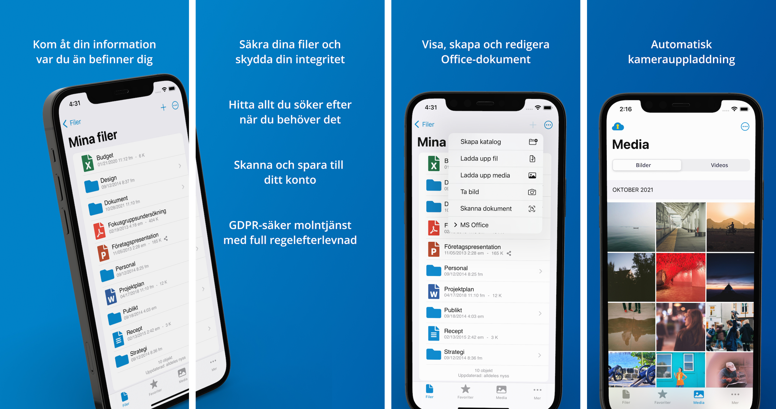Med appen kan du bland annat få automatisk kamerauppladdning av bilder och videos, skanna filer direkt till ditt Storegate konto och redigera Office-filer. Du hämtar Storegates app via AppStore eller Google Play Butik.