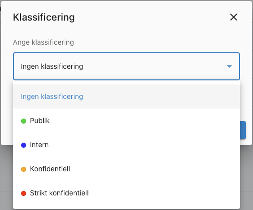 Informationsklassning gör det möjligt att märka filer och mappar med en säkerhetsklass för att tydliggöra hur information får hanteras inom organisationen. Klassningen är endast avsedd för data som lagras inom Storegate och används för visuell vägledning och styrning.